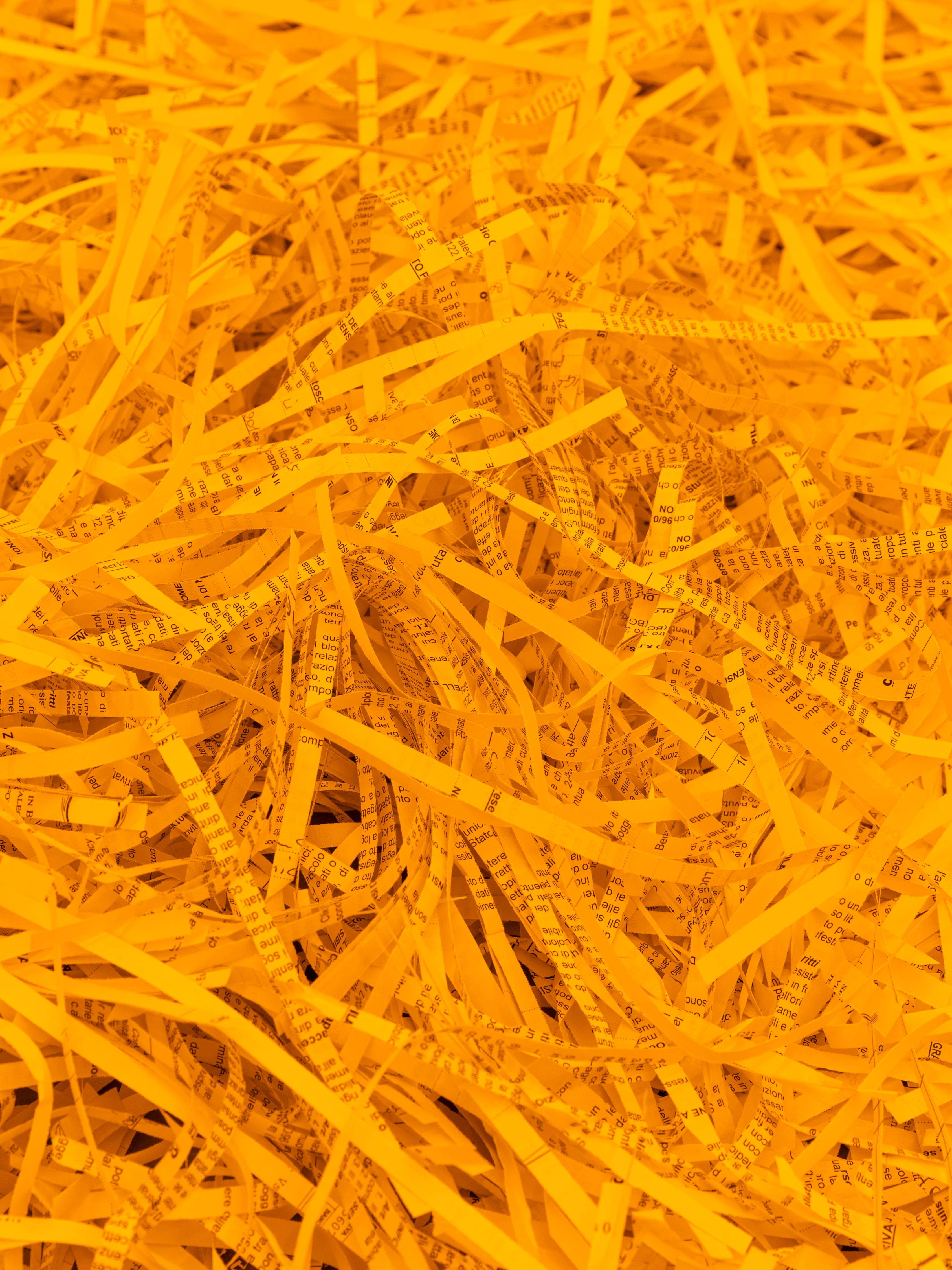 I believe this time Paolo has played a nasty trick on me. I have to write a text on an exhibition that literally emerges from a haystack of shredded papers, almost as if he wants to warn: mind that the work is born where the word ends. So I find myself looking for the famous needle with an inadequate medium, and as I write I hear the noise of the shredder, with him giggling as he inserts the pages. I confirm the first impression, there is nothing to decipher. I should stop here, yet everything seems to ask to be.